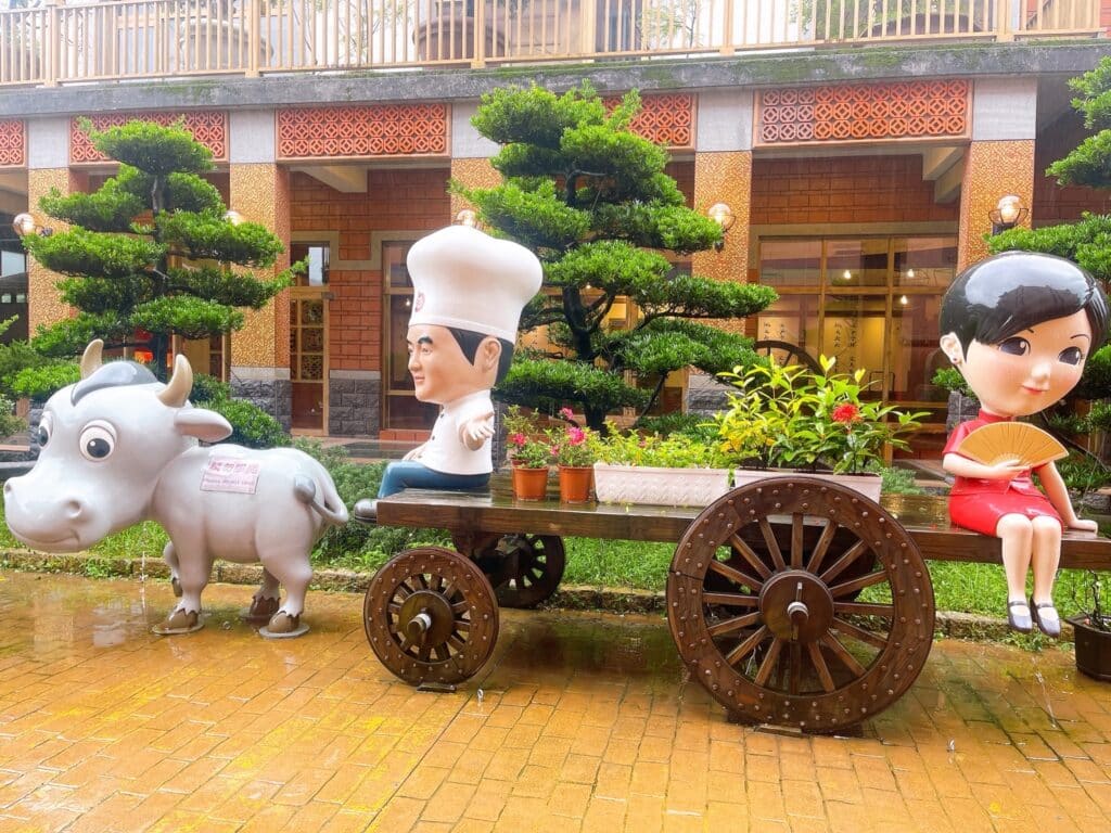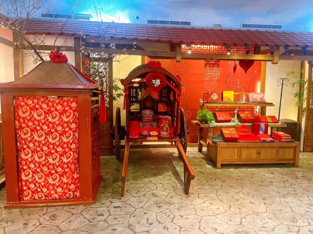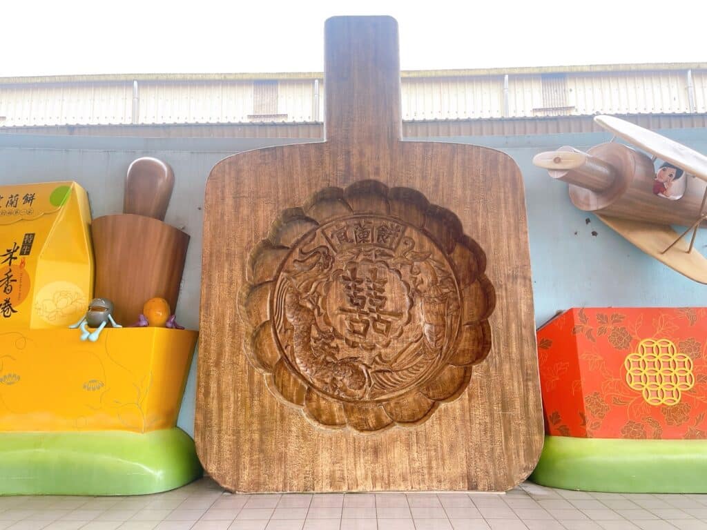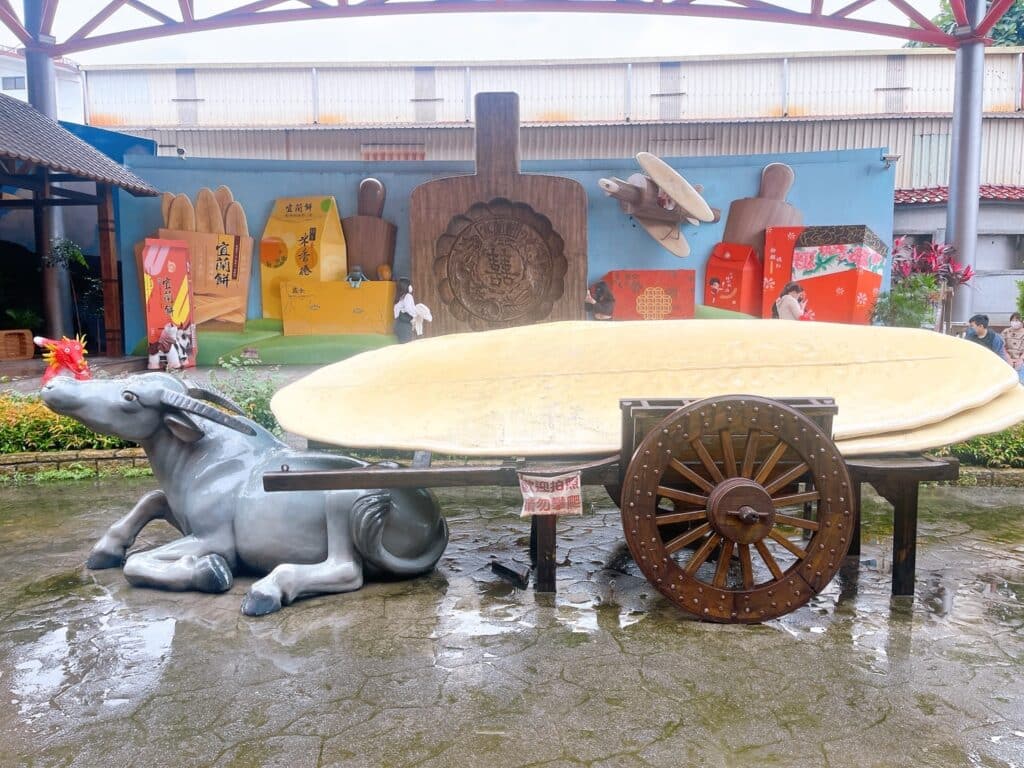 ▼ 景觀廣場放置了超大餅模、牛舌餅和大型牛車,充份營造出婚嫁習俗的喜慶氛圍。